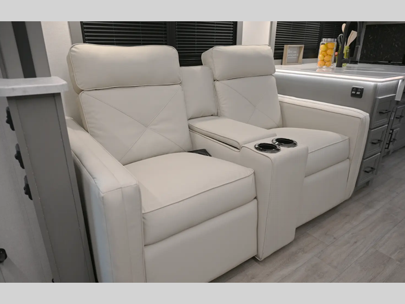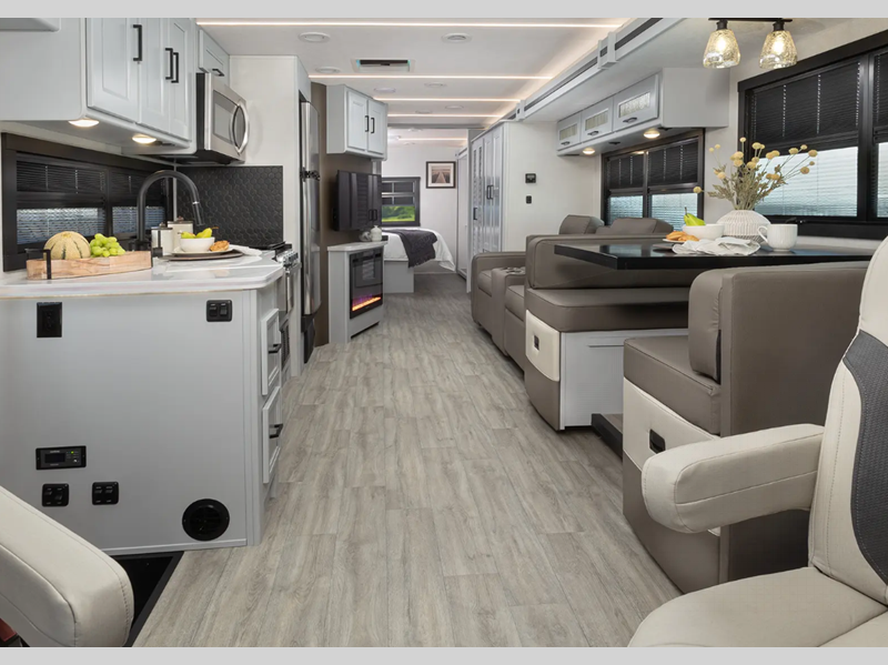 Sleeps 6 Slides 1 Length 34 ft 10 in Ext Width 8 ft 6 in Ext Height 12 ft 5 in Interior Color Champagne, Mocha Exterior Color Partial Paint Option. Full Body Paint; Glaucous, Graphite, Scarlet. Night Moves (Limited) Hitch Weight 8000 lbs GVWR 22000 lbs Fresh Water Capacity 70 gals Grey Water Capacity 45 gals Black Water Capacity 45 gals Tire Size 22.5 Furnace BTU 30000 btu Generator 5.5kw Gas Fuel Type Gasolline Engine 7.3L V8 Chassis Ford F53 Horsepower 350 hp Fuel Capacity 80 gals Wheelbase 228 in Number Of Bunks 1 Available Beds King Torque 468 ft-lb Refrigerator Type Stainless Steel Residential Cooktop Burners 3 Shower Size 32" x 32" Number of Awnings 2 Axle Weight Front 7500 lbs Axle Weight Rear 13500 lbs LP Tank Capacity 84 lbs Water Heater Type On Demand TV Info LR 40" Smart TV, BR 32" LED TV, Ext. LED TV Awning Info 15' & 10' Power Washer/Dryer Available Yes Gross Combined Weight 26000 lbs Shower Type Radius Electrical Service 50 amp Similar Floorplans